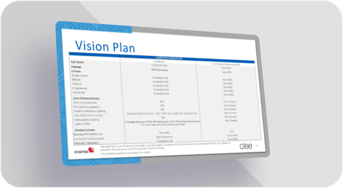 Vision Plan AMERITAS VISION PLAN In-Network Out-of-Network Reimbursement Eye Exam Covered in full Up to $45 Frames $250 allowance Up to $70 Lenses Single Vision Covered in full Up to $30 Bifocal Covered in full Up to $50 Trifocal Covered in full Up to $65 Progressive Covered in full Up to $50 Lenticular Covered in full Up to $100 Lens Enhancements Not Covered Std. Polycarbonate $40 Tint (solid & gradient) $15 Not Covered Scratch Resistant Coating $15 Not Covered Anti-Reflective Coating Standard: $45; Premium - Tier 1: $57; Tier 2: $68; Tier 3: 80% of cost Not Covered Ultraviolent Coating $15 Not Covered Lasik or PRK Average discount of 15% off retail price or 5% off promotional price at Not Covered US Laser Network participating providers. Contact Lenses Standard fit & follow up Up to $60 N/A Conventional/Disposable $200 allowance Up to $145 Medically Necessary Covered in full Up to $210 *Services from out-of-network providers may be subject to balance billing (member would be responsible for any difference between the allowance and the provider’s actual charge). 13 **All benefits available once every 12 months