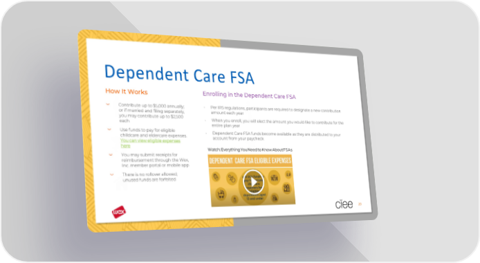 Dependent Care FSA How It Works Enrolling in the Dependent Care FSA Contribute up to $5,000 annually; - Per IRS regulations, participants are required to designate a new contribution or if married and filing separately, amount each year you may contribute up to $2,500 - When you enroll, you will elect the amount you would like to contribute for the each entire plan year Use funds to pay for eligible - Dependent Care FSA funds become available as they are distributed to your childcare and eldercare expenses. account from your paycheck You can view eligible expenses here Watch: Everything You Need to Know About FSAs You may submit receipts for reimbursement through the Wex, Inc. member portal or mobile app There is no rollover allowed; unused funds are forfeited 20