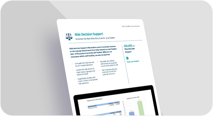 Health Benefits Consulting Suite Risk Decision Support Illustrate the Best Risk Structure for your Clients Risk Decision Support (RD) enables users to evaluate whether SOLVED with or not a group should move from fully insured to a self-funded Risk Decision plan. If the group is currently self-funded, different risk Support: structures within self-funding can also be explored. • Evaluate the fully insured • Illustrate the relative to self-funded decision differences in expected Stop-Loss Analysis • Locate the risk structure return and capital at risk that meets a group’s risk • Test multiple stop loss tolerance level scenarios to find the • Graphically display and optimal outcome score current or proposed risk scenarios