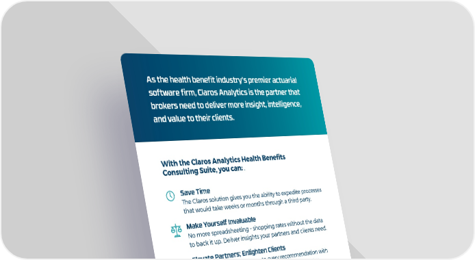 As the health benefit industry’s premier actuarial software firm, Claros Analytics is the partner that brokers need to deliver more insight, intelligence, and value to their clients. With the Claros Analytics Health Benefits Consulting Suite, you can: . Save Time The Claros solution gives you the ability to expedite processes that would take weeks or months through a third party. Make Yourself Invaluable No more spreadsheeting – shopping rates without the data to back it up. Deliver insights your partners and clients need. Elevate Partners; Enlighten Clients Bring clarity and confidence to every recommendation with the most precise consulting application in the industry. Health Benefits Consulting Suite Actuarial Risk Decision Experience Assistant Support & Migration Simulate expected Identify a risk- Predictive changes and appropriate self- Set optimal budget calculate precise funded structure. rates and model claim rates. impact of forecasted enrollment. [email protected] | 609.275.6550 clarosanalytics.com