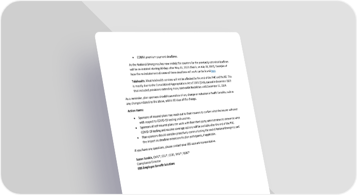 • COBRA premium payment deadlines. As the National Emergency has now ended, the counters for the previously extended deadlines will be re-instated starting 60 days after May 11, 2023 (that is, on July 10, 2023). Examples of how the re-instatement of some of these deadlines will work can be found here. Telehealth. Most telehealth services will not be affected by the end of the PHE and the NE. This is mostly due to the Consolidated Appropriations Act of 2023 (CAA), passed in December 2022 that included provisions extending many telehealth flexibilities until December 31, 2024. As a reminder, plan sponsors should issue notice of any change or reduction in health benefits, such as any changes related to the above, within 60 days of the change. Action Items: • Sponsors of insured plans may reach out to their insurers to confirm what the insurer will cover with respect to COVID-19 testing and vaccines. • Sponsors of self-insured plans can work with their third-party administrators to determine what COVID-19 testing and vaccine coverage options will be available after the end of the PHE. • Plan sponsors should consider proactively communicating the end of National Emergency and the impact on deadline extensions to plan participants, if applicable. If you have any questions, please contact your EBS account representative. Susan Sonkin, ChFC®, CLU®, CEBS, RHU®, REBC® Compliance Director EBS Employee Benefit Solutions