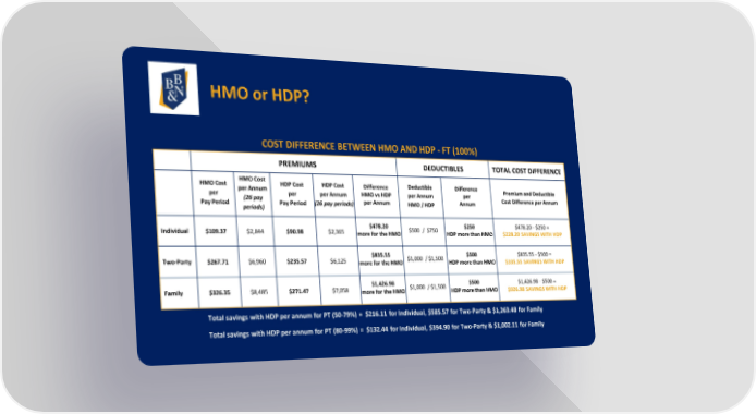 An overview of the cost differences between the HMO and HDP plans offered to eligible BB&N employees and their families.