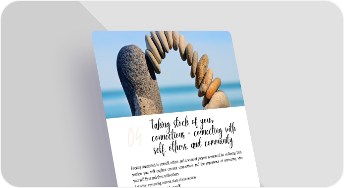Feeling connected to oneself, others, and a sense of purpose is essential for wellbeing. This session you will explore current connections and the importance of connecting with yourself first and then with others. Activity: reviewing current state of connection Practice: Connecting with oneself Session Notes: Taking stock of your connections - connecting with self, others, and community 04 IMA WHOLE HEALTH PROGRAMS | PAGE 08