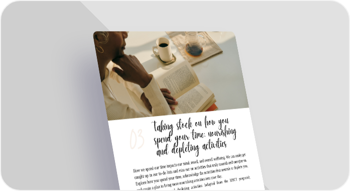 How we spend our time impacts our mind, mood, and overall wellbeing. We can easily get caught up in our to-do lists and miss out on activities that truly nourish and energize us. Explore how you spend your time, acknowledge the activities that nourish or deplete you, and create a plan to bring more nourishing activities into your day. Activity: Nourishing and depleting activities (adapted from the MBCT program); Planning for nourishing activities Practice: Working with depleting and/or draining activities Session Notes: Taking stock on how you spend your time: nourishing and depleting activities 03 IMA WHOLE HEALTH PROGRAMS | PAGE 06