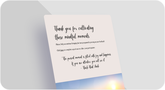 Please, help us continue bringing the best programs by proving us your feedback! Click here to complete a quick survey after your participation Thank you for cultivating these mindful moments. "The present moment is filled with joy and happiness. If you are attentive, you will see it" - Thich Nhat Hanh