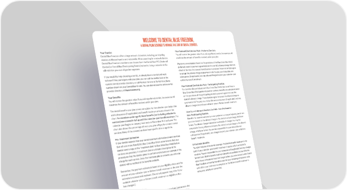 Your Dentist Dental Blue Freedom offers a large network of dentists, including participating dentists in Massachusetts and nationwide. When searching for a network dentist, Dental Blue Freedom members can choose from the Dental Blue PPO (Preferred Dentist) or Dental Blue (Participating Dentist) networks. Using a network dentist will minimize your out-of-pocket expenses. If you would like help choosing a dentist, or already have a dentist and want to know if they participate with your plan, you can call the dentist, look at the current dental provider directory, or call Member Service at the toll-free phone number shown on your Dental Blue ID card. You can also access the online dental provider directory at bluecrossma.org. Your Benefits You will receive the greatest value if you visit a preferred dentist, because you will maximizetheamountofbenefitsreceivedunderyourplan. Thedentalbenefitsyourplancoversaresubjecttothecalendar-yeardeductible andcoinsurance(ifapplicable),andbenefitmaximumamountsshowninthe chart. For members under age 13, these benefits (not including orthodontic services) are covered in full up until the calendar-year benefit maximum. The calendar year begins on January 1 and ends on December 31 of each year. The chart also shows the percentage of costs your plan will pay for covered dental services.Manyofthecoveredserviceshavespecifictimeoragelimits. Pre-Treatment Estimates If your dentist expects that your dental treatment will involve covered services that will cost more than $250, Blue Cross Blue Shield recommends that your dentist send a copy of the “treatment plan” to Blue Cross Blue Shield before services are provided. A treatment plan is a detailed description of the procedures that the dentist plans to perform and includes an estimate of the charge for each service. Once the treatment plan is reviewed, you and your dentistwillbenotifiedofthebenefitsavailable. Remember, the payment estimate is based on your eligibility status and the amountofyourcalendar-yearorlifetimebenefitmaximumatthetimethe estimate is received and reviewed. (The actual payment may differ if your availablecalendar-yearorlifetimebenefitmaximumoreligibilitystatus has changed.) Multi-Stage Procedures Yourdentalplanprovidesbenefitsformulti-stageprocedures(proceduresthat require more than one visit, such as crowns, dentures and root canals) as long as you are enrolled in the plan on the date that the multi-stage procedure is completed. A participating dentist will send a claim for a multi-stage procedure to Blue Cross Blue Shield only after the completion date of the procedure. You will be responsible for all charges for multi-stage procedures if your plan has been cancelled before the completion date of the procedure. How Network Dentists Are Paid - Preferred Dentists You will receive the greatest value if you visit a preferred dentist, because you will maximizetheamountofbenefitsreceivedunderyourplan. Payments are calculated based on the provisions of the Blue Cross Blue Shield preferred dentist’s payment agreement and the dentist’s allowed charge that is in effect at the time the covered dental service is provided. Preferred dentists agree to accept the allowed charge as payment in full. You pay your deductible and coinsurance (if applicable), and any allowed charges beyond your calendar-year orlifetimebenefitmaximum. How Network Dentists Are Paid - Participating Dentists For dentists who participate with Blue Cross Blue Shield, but do not have a BlueCrossBlueShieldpreferredprovidercontract,benefitsarecalculatedbased on the provisions of the participating dentist’s payment agreement and the dentist’s allowed charge. These dentists agree to accept the allowed charge as payment in full. You pay your deductible and coinsurance (if applicable), and any allowedchargesbeyondyourcalendar-yearorlifetimebenefitmaximum. How Out-of-Network Dentists Are Paid - Non-Preferred or Non-Participating Dentists Benefitsforcoveredservicesbyanon-preferredornon-participatingdentistare provided based on the allowed charge or the dentist’s actual charge, whichever is less. The allowed charge is based on a schedule of charges. You may be responsible for any difference between the dentist’s actual charge or the allowed charge, whichever is less. You are also responsible for your deductible and coinsurance (if applicable), and charges beyond your calendar-year or lifetime benefitmaximum. Orthodontic Benefits Yourplanincludesorthodonticcoverage.Thelifetimebenefitmaximumisnot partofyourcalendar-yearbenefitmaximum;itappliesonlytoorthodontic services. You are responsible for your coinsurance (if applicable) and any charges beyondyourlifetimebenefitmaximum.Benefitsareavailableonyoureffective date. If your orthodontic treatment began before you were covered under Dental Blue Freedom, a monthly fee will be paid for your remaining orthodontic visits untileitheryourtreatmentiscompletedorthelifetimebenefitmaximumis exhausted,whichevercomesfirst. Welcome to Dental Blue freedom, A DENTAL PLAN DESIGNED TO MANAGE THE COST OF DENTAL SERVICES.