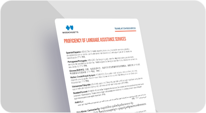 TRANSLATION RESOURCES Proficiency of Language Assistance Services Spanish/Español: ATENCIÓN: Si habla español, tiene a su disposición servicios gratuitos de asistencia con el idioma. Llame al número de Servicio al Cliente que figura en su tarjeta de identificación (TTY: 711). Portuguese/Português: ATENÇÃO: Se fala português, são-lhe disponibilizados gratuitamente serviços de assistência de idiomas. Telefone para os Serviços aos Membros, através do número no seu cartão ID (TTY: 711). Chinese/简体中文: 注意:如果您讲中文,我们可向您免费提供语言协助服务。请拨打您 ID 卡上的 号码联系会员服务部(TTY 号码:711)。 Haitian Creole/Kreyòl Ayisyen: ATANSYON: Si ou pale kreyòl ayisyen, sèvis asistans nan lang disponib pou ou gratis. Rele nimewo Sèvis Manm nan ki sou kat Idantitifkasyon w lan (Sèvis pou Malantandan TTY: 711). Vietnamese/Tiếng Việt: LƯU Ý: Nếu quý vị nói Tiếng Việt, các dịch vụ hỗ trợ ngôn ngữ được cung cấp cho quý vị miễn phí. Gọi cho Dịch vụ Hội viên theo số trên thẻ ID của quý vị (TTY: 711). Russian/Русский: ВНИМАНИЕ: если Вы говорите по-русски, Вы можете воспользоваться бесплатными услугами переводчика. Позвоните в отдел обслуживания клиентов по номеру, указанному в Вашей идентификационной карте (телетайп: 711). Arabic/برية: فتاهلا زاهج) كتيوه ةقاطب لىع دوجولما مقرلا لىع ءاضعلأا تامدخب لصتا .كل ةبسنلاب اناجم ةيوغللا ةدعاسلما تامدخ رفوتتف ،ةيبرعلا ةغللا ثدحتت تنك اذإ :هابتنا .(711 :”TTY“ مكبلاو مصلل صينلا Mon-Khmer, Cambodian/ខ្មែរ: ការជនដណង៖ ប្រសនប្រអ្នកនយាយភាសា ខ្មែរ បសវាជនយភាសាឥតគតថ្លៃ គអាចរកបានសបរា្រអ្នក។ សមទរសព្ទបៅខ្កបសវាសរាជកតាមបេ្ បៅបេ្រ័ណ្ណ សរាេ្លៃនរ្រសអ្នក (TTY: 711)។ French/Français: ATTENTION : si vous parlez français, des services d’assistance linguistique sont disponibles gratuitement. Appelez le Service adhérents au numéro indiqué sur votre carte d’assuré (TTY : 711). Italian/Italiano: ATTENZIONE: se parlate italiano, sono disponibili per voi servizi gratuiti di assistenza linguistica. Chiamate il Servizio per i membri al numero riportato sulla vostra scheda identificativa (TTY: 711). Korean/한국어: 주의: 한국어를 사용하시는 경우, 언어 지원 서비스를 무료로 이용하실 수 있습니다. 귀하의 ID 카드에 있는 전화번호(TTY: 711)를 사용하여 회원 서비스에 전화하십시오. Greek/Eλληνικά: ΠΡΟΣΟΧΗ: Εάν μιλάτε Ελληνικά, διατίθενται για σας υπηρεσίες γλωσσικής βοήθειας, δωρεάν. Καλέστε την Υπηρεσία Εξυπηρέτησης Μελών στον αριθμό της κάρτας μέλους σας (ID Card) (TTY: 711). ُ ً ូ ំ ឹ ិ ើ ិ ំ ួ ិ ឺ ់ ូ ូ ័ ្ន ិ ើ គា ់ ួ ់ Blue Cross Blue Shield of Massachusetts is an Independent Licensee of the Blue Cross and Blue Shield Association.