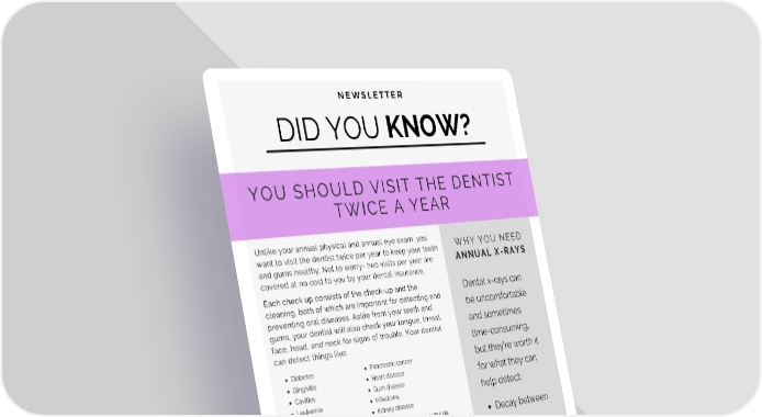 Diabetes Gingivitis Cavities Leukemia Oral cancer Pancreatic cancer Heart disease Gum disease Infections Kidney disease DID YOU KNOW? N E W S L E T T E R Each check up consists of the check-up and the cleaning, both of which are important for detecting and preventing oral diseases. Aside from your teeth and gums, your dentist will also check your tongue, throat, face, head, and neck for signs of trouble. Your dentist can detect things like: YOU SHOULD VISIT THE DENTIST TWICE A YEAR WHY YOU NEED ANNUAL X-RAYS Dental x-rays can be uncomfortable and sometimes time-consuming, but they're worth it for what they can help detect: To make your dental cleanings last, be sure you're brushing for at least 2 minutes 2x/day, and flossing daily! Decay between teeth Bone loss Abscesses Cavities and more Unlike your annual physical and annual eye exam, you want to visit the dentist twice per year to keep your teeth and gums healthy. Not to worry- two visits per year are covered at no cost to you by your dental insurance.