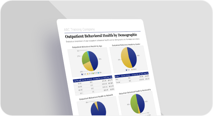 ABC Training Company Outpatient Behavioral Health by Demographic Evaluate a breakdown of your outpatient behavioral health care by demographics to illuminate cost drivers. Outpatient Behavioral Health by Age Outpatient Behavioral Health by Gender 3% 27% 46% 46% 54% 24% 0-19 20-39 40-59 60+ Male Female Age Range Number of Visits Average Paid per Visit Total Paid Gender Number of Visits Average Paid per Visit Total Paid 0-19 333 $71.40 $23,775 Male 335 $76.28 $25,553 20-39 177 $100.68 $17,821 Female 390 $105.99 $41,337 40-59 193 $120.61 $23,278 60+ 22 $91.64 $2,016 Outpatient Behavioral Health by Network Outpatient Behavioral Health by Relationship 6% 48% 48% 94% 5% In Network Out Of Network Employee Spouse Dependent Network Number of Average Paid per Total Relationship Number of Visits Average Paid per Visit Total Paid Visits Visit Paid Employee 345 $111.46 $38,453 In Network 695 $86.89 $60,389 Spouse 34 $103.32 $3,513 Out Of 44 $147.74 $6,501 Dependent 346 $72.04 $24,924 Network Points to consider: • Is there a specific demographic with higher utilization or costs? • How can you structure communication and delivery strategies to impact appropriate audiences? Copyright @ 2017 Zywave, Inc. 351737 - January 1, 2018 - December 31, 2018[41]