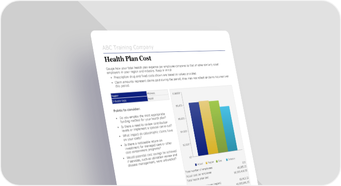 ABC Training Company Health Plan Cost Gauge how your total health plan expense per employee compares to that of other similarly sized employers in your region and industry. Keep in mind: • Prescription drug and fixed costs shown are based on values provided. • Claim amounts represent claims paid during the period; they may not reflect all claims incurred over this period. Region Midwest $10,000 Industry type Retail Points to consider: $8,000 • Do you employ the most appropriate funding method for your health plan? • Is there a need to review contribution $6,000 levels or implement a spousal carve-out? • What impact do catastrophic claims have $4,000 on your costs? • Is there a noticeable return on investment for managed care or other cost containment programs? $2,000 • Would potential cost savings be achieved if services, such as utilization review and disease management, were unbundled? $0 Actual Region Size Industry Total number of employees 831 Actual cost per employee $8,295.33 Total health plan cost $6,893,416.55 Norm cost per employee (region) $8,412.32 Norm total cost (region) $6,990,641.00 Norm cost per employee (employer size) $8,274.49 Norm total cost (employer size) $6,876,103.00 Norm cost per employee (industry type) $7,244.06 Norm total cost (industry type) $6,019,812.00 Norm source: "Employer Health Benefits 2014 Annual Survey", The Henry J. Kaiser Family Foundation and Health Research and Educational Trust, September 2014. Copyright @ 2017 Zywave, Inc. 351737 - January 1, 2018 - December 31, 2018[3]