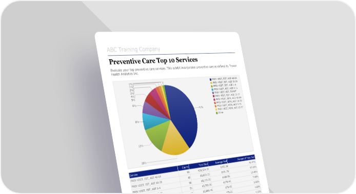 ABC Training Company Preventive Care Top 10 Services Evaluate your top preventive care services. This exhibit incorporates preventive care as defined by Truven Health Analytics Inc. 1% PREV VISIT, EST, AGE 40-64 1% PREV VISIT, EST, AGE 18-39 2% PREV VISIT, EST, AGE 1-4 2% PREV VISIT, EST, AGE 5-11 4% PREV VISIT, EST, INFANT 5% PREV VISIT, EST, AGE 12-17 6% PREV VISIT, NEW, AGE 40-64 PREV VISIT, NEW, AGE 18-39 41% PREV VISIT, NEW, AGE 5-11 PREV VISIT, NEW, AGE 12-17 8% Other 12% 18% Service Claims Total Paid Average Paid Percent of Total Paid PREV VISIT, EST, AGE 40-64 99 $20,324.31 $205.30 41.47% PREV VISIT, EST, AGE 18-39 45 $8,629.23 $191.76 17.61% PREV VISIT, EST, AGE 1-4 38 $6,115.20 $160.93 12.48% PREV VISIT, EST, AGE 5-11 21 $3,768.26 $179.44 7.69% PREV VISIT, EST, INFANT 38 $2,866.46 $75.43 5.85% PREV VISIT, EST, AGE 12-17 30 $2,376.36 $79.21 4.85% PREV VISIT, NEW, AGE 40-64 10 $2,106.82 $210.68 4.30% PREV VISIT, NEW, AGE 18-39 7 $980.02 $140.00 2.00% PREV VISIT, NEW, AGE 5-11 3 $743.32 $247.77 1.52% PREV VISIT, NEW, AGE 12-17 4 $542.70 $135.68 1.11% Points to consider: • Are the types of services consistent with your demographics? • Is there an opportunity to promote specific services through communication and education? Copyright @ 2017 Zywave, Inc. 351737 - January 1, 2018 - December 31, 2018[55]