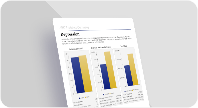ABC Training Company Depression Assess the impact of depression on your participants and plan compared to that of your peers. For this report, the data includes only costs associated with the primary diagnosis of depression. The total cost of care for an affected patient is not considered in this exhibit. Patients per 1000 Average Paid per Claimant Total Paid 60 $1,000 $80,000 50 $800 $60,000 40 $600 30 $40,000 $400 20 $20,000 10 $200 0 $0 $0 Actual Norm Average Norm Actual Total Norm Total Actual patients 69 Average paid/claimant $657.80 Actual total paid $45,389 Norm patients 72 Norm paid/claimant $985.67 Norm total paid $70,648 Amount over/under norm -3 Amount over/under norm ($327.86) Amount over/under norm ($25,260) Percent over/under norm -3.73% Percent over/under norm -33.26% Percent over/under norm -35.75% Points to consider: • Is there an opportunity to better manage costs related to depression? • Have you considered starting the conversation with a communication campaign? For general health information on depression, refer to: • National Mental Health Association, www.nmha.org. • National Institute for Mental Health, www.nimh.nih.gov. Norm source: Copyright ©2018 Truven Health Analytics Inc. MarketScan® Research Databases. All rights reserved. Copyright @ 2017 Zywave, Inc. 351737 - January 1, 2018 - December 31, 2018[60]