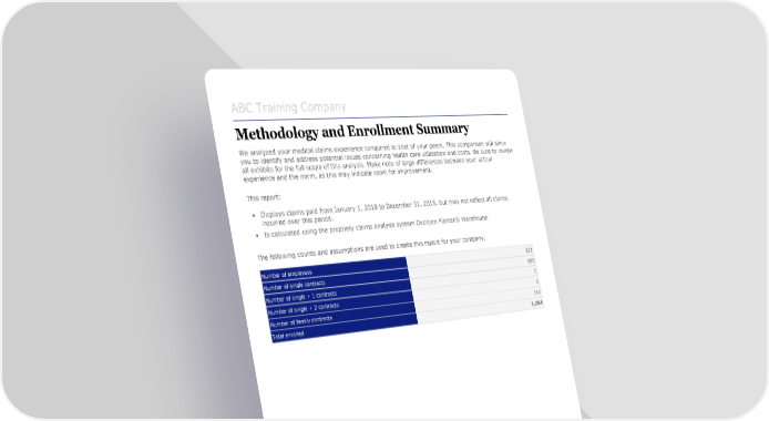 ABC Training Company Methodology and Enrollment Summary We analyzed your medical claims experience compared to that of your peers. This comparison will allow you to identify and address potential issues concerning health care utilization and costs. Be sure to review all exhibits for the full scope of this analysis. Make note of large differences between your actual experience and the norm, as this may indicate room for improvement. This report: • Displays claims paid from January 1, 2018 to December 31, 2018, but may not reflect all claims incurred over this period. • Is calculated using the propriety claims analysis system Decision Master® Warehouse. The following counts and assumptions are used to create this report for your company: Number of employees 831 Number of single contracts 688 Number of single + 1 contracts 0 Number of single + 2 contracts 0 Number of family contracts 143 Total enrolled 1,284 This document contains confidential and/or proprietary information, and may be used only by the person or entity to which it is addressed. Copyright @ 2017 Zywave, Inc. 351737 - January 1, 2018 - December 31, 2018[2]