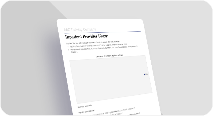 ABC Training Company Inpatient Provider Usage Review the top 10 inpatient providers. For this report, the data includes: • Facility fees, such as hospital room and board, supplies, and ancillary services. • Professional services fees, such as physician, surgeon, and anesthesiologist (0 admissions will display). Inpatient Providers by Percentage Other No Data Available Points to consider: • How effective is your plan at steering participants to network providers? • What factors, if any, drive out-of-network utilization? • Is there an opportunity to negotiate better discounts from your top providers? Copyright @ 2017 Zywave, Inc. 351737 - January 1, 2018 - December 31, 2018[24]