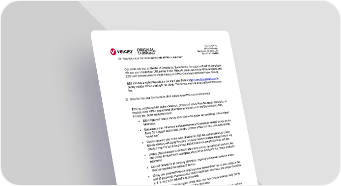 Velcro USA Inc. 95 Sundial Avenue Manchester, NH 03103 USA 38. How does your firm assist clients with HIPAA compliance? Tel: (+1) 603 669 4880 Our clients can lean on Director of Compliance, Susan Sonkin, for support with HIPAA compliance. We also use a toolkit from UBA partner Fisher Phillips to ensure we remain HIPAA compliant, and EBS team members receive annual training on HIPAA Compliance and Data Privacy Training. EBS also has a relationship with the law firm Fisher Phillips https://www.fisherphillips.com/ to deploy modular HIPAA training to our clients. This service would be at an additional discounted fee. 39. Describe how your firm maintains client records in a HIPAA secure environment. EBS has adopted policies and procedures to protect and secure Protected Health Information as required under HIPAA and personal information as required under the Massachusetts Data Privacy law. Some examples include: • EBS Employees receive training each year on the proper way to maintain HIPAA related information. • Data backup plan: All servers are backed up every 15 minutes to a raided storage device. Every file is logged and tracked, enabling recovery of files that have been subsequently “saved over”. • Disaster recovery plan: In the event of a disaster, EBS has contracted through United Benefit Advisors with Agility Recovery to ensure minimal downtime and recovery of any data that might be lost in the process, both for electronic and physical data and files. • Limiting physical access to electronic information and our facility through electronic key card access for doors to the workspace, key locks on all cabinets that contain privileged information. • Secured Firewall for all company information, requiring both firewall password access AND individualized user password access. • 90-day user password time-out, requiring a new password that has not been utilized in the past 20 passwords. Passwords also require capitalized, lower case, and unique characters (!, #, &, etc.) to be included in all passwords. • All users can transmit encrypted emails easily from their Outlook desktops using 256-bit Advanced Encryption Standard encryption technology. 40. Describe your in-house legal advisors or outside counsel who provides guidance to you and your clients? Josie Martinez, Senior Partner, is our in-house General Counsel. Fisher Phillips is our preferred external resource on a national basis. EBS also maintains relationships several local New England law firms. 41. Describe methods you employ to disseminate information about current trends and legislation. Please provide examples. EBS Director of Compliance, Susan Sonkin, would provide you with timely compliance alerts and updates. Urgent alerts are disseminated via email as soon as possible. Susan is always a phone call or email away, so you can reach out to her anytime with questions or concerns. Please see exhibit I for an example of a compliance alert. 22