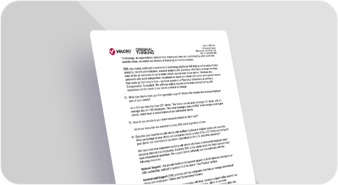 Velcro USA Inc. 95 Sundial Avenue Manchester, NH 03103 USA Tel: (+1) 603 669 4880 Technology; as organizations realized their employees were not understanding what all of their benefits mean, we added our Director of Marketing & Communications. EBS also makes continued investments in technology platforms that help us in the areas of claim analytics, benefit administration, actuarial analysis and pharmacy informatics to insure we have state of the art resources for us to better deliver our services to our clients. We have also partnered with some independent consultants to assist our clients with some more specific issues that come up from time to time – we have access to a Pharmacy Consultant as well as a Compensation Consultant. We will keep adding experts to the team and partnering with consultants as the needs of our clients continue to change. 12. What size clients does your firm generally support? What is the median and average employee size of your clients? As a firm we currently have 207 clients. The Velcro service team manages 12 clients, with an average size of 1150 employees. This team manages many of EBS’ most complex and largest clients, which have a concentration of our self-funded clients. 13. How do you structure your team resources based on client size? All of our resources are available to every EBS client regardless of size. 14. Describe your experience with clients with multiple locations in multiple states and countries. What percentage of your clients are companies based outside of the U.S.? What percentage of your clients has international operations (operations in the U.S. and other countries)? We have extensive experience working with clients who have a widespread employee base, including international employees. Currently 33% of the clients within the Velcro service team have international operations. We support clients nationally and internationally with the following resources: National Support | We provide boots-on-the-ground support in all 50 states by leveraging our UBA partnership, outlined in question 8 of the above ‘Your Practice’ section. International Support | EBS partners with two companies that help us manage international clients and employees: Globex and Globalization Partners. It has been our experience that this partnership with local, domestic subject matter experts has been extremely effective to assist our clients on a global basis. Within all domestic brokerage/consultant operations there can be a disconnect between the domestic office that leads the engagement and the “international” office that may assist with global efforts. Having a global partner here in the United States that spearheads this initiative allows our clients access, customization, accountability, and a true partner to manage global benefit needs and initiatives. Globex | Through our seventeen-year partnership with Globex International, we have access to a broad range of international benefits brokerage capabilities in 160 countries and jurisdictions worldwide. Founded in 1993, Globex International is an international employee benefits, insurance and risk management consulting firm for brokers and agents, providing their customers with an in-house international department or resource, which brings international capabilities and expertise to their operations and customers. Key benefits include: 10