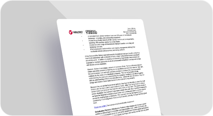Velcro USA Inc. 95 Sundial Avenue Manchester, NH 03103 USA Tel: (+1) 603 669 4880 • A dedicated team whose members have over 200 years of international brokerage, consulting, and underwriting experience. • Access to worldwide network of 300 “partner” brokers and correspondents, spanning 160 countries outside the United States. • Access to a wide range of international employee benefits consulting and brokerage services. • Effective program implementation and ongoing management utilizing their worldwide network and proprietary technology platform. A key feature of the Globex approach towards international employee benefits is that they have built relationships with a network of “best of class” independent brokers/consultants around the world. In addition to meeting local licensing requirements, these brokers are expected to maintain appropriate levels of professional liability/E&O coverage and comply with Globex service standards. However, Globex is not simply a network of overseas offices. The true difference between Globex and other providers is that they do not specifically promote their network. Their aim, first and foremost, is to work with selected providers to construct the most appropriate solutions for the needs of multinational companies. This has its foundation in fully understanding the exposures presented by the company’s worldwide operations together with an understanding of their corporate philosophy. Armed with this information, they can design and market a tailor-made solution to the customer’s requirements. Because they are not tied to an owned network, they have the flexibility to select the local brokers who are best suited to your particular needs, rather than being forced to utilize a certain broker just because they have the same name on their door. This can be crucial in certain situations. For example, if you have a small office with only a handful of employees, we have the flexibility to choose a local broker who is willing and able to provide superior service for small groups or individuals. This approach ensures the highest level of consistency of servicing levels from country to country, centrally managed by their global team. Please see exhibit C for a sample of a Global Benefits Assessment. Globalization Partners | Globalization Partners helps engage and manage a global workforce without legal complexities and unpredictable costs. Under this model, any international employees would be part of the Globalization Partners global professional employer organization with their payroll, tax filings, and country-specific laws regulated by Globalization Partners. 15. Describe any current or recent relationships you've had with Velcro Companies or in a global context. EBS is the current broker of Velcro Companies’ benefits program. 16. Why do clients leave your organization? At EBS we have a lot of strong, long-standing relationships with our clients. However, we do occasionally lose clients, and it is typically because: - The company is sold and/or acquired by a larger company and moves onto the benefit plan of the acquiring company. 11