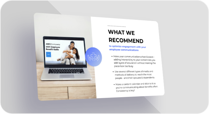 WHAT WE RECOMMEND to optimize engagement with your employee communications Make your communications short & sweet - adding interactivity to your content lets you add layers of education without making the piece look too busy Use several different types of media and methods of delivery to reach the most people - and their spouses & dependents Make a content calendar and stick to it so you're communicating about benefits often. Consistency is key!