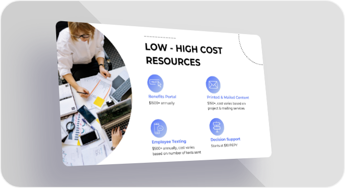 LOW - HIGH COST RESOURCES Benefits Portal Printed & Mailed Content $1500+ annually $150+, cost varies based on project & mailing services Decision Support Employee Texting Starts at $10 PEPY $500+ annually, cost varies based on number of texts sent