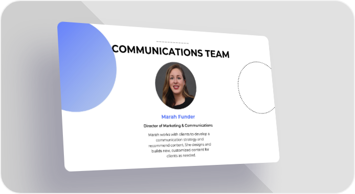 COMMUNICATIONS TEAM Marah Funder Director of Marketing & Communications Marah works with clients to develop a communication strategy and recommend content. She designs and builds new, customized content for clients as needed.