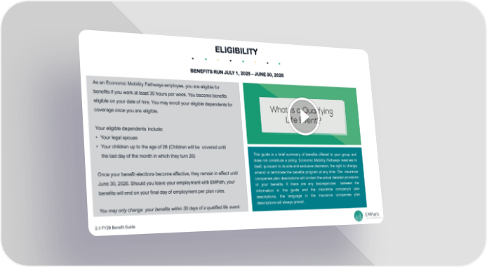 This guide is a brief summary of benefits offered to your group and does not constitute a policy. Economic Mobility Pathways reserves to itself, pursuant to its sole and exclusive discretion, the right to change, amend or terminate the benefits program at any time. The insurance companies plan descriptions will contain the actual detailed provisions of your benefits. If there are any discrepancies between the information in the guide and the insurance company’s plan descriptions, the language in the insurance companies plan descriptions will always prevail. As an Economic Mobility Pathways employee, you are eligible for benefits if you work at least 30 hours per week. You become benefits eligible on your date of hire. You may enroll your eligible dependents for coverage once you are eligible. Your eligible dependents include: • Your legal spouse • Your children up to the age of 26 (Children will be covered until the last day of the month in which they turn 26) Once your benefit elections become effective, they remain in effect until June 30, 2026. Should you leave your employment with EMPath, your benefits will end on your final day of employment per plan rules. You may only change your benefits within 30 days of a qualified life event. BENEFITS RUN JULY 1, 2025 – JUNE 30, 2026 ELIGIBILITY 2 // FY26 Benefit Guide