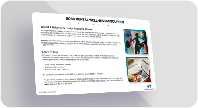 Mental & Behavioral Health Resource Center Nothing should stand between you and your mental wellness, whether that means emotional, psychological, or social well-being. Your mental health is essential to your overall well-being. BCBSMA’s Mental Health Resource Center is the place to explore your care options, insightful information, and helpful wellness choices. Members can review difference resources available as well as check out difference articles and videos but visiting the BCBSMA Mental Health Resource Center. If you do not find what you need there, Team Blue can help by calling 1-888-389-7764. Learn to Live Get support for your mental health. If you’re ready to get support for your mental health, Learn To Live, an independent company, may be able to help. Use it to identify and work through your thoughts and behaviors by accessing self-guided, personalized programs that can help with: o Social anxiety, depression, insomnia o Stress, anxiety, and worry o Substance use, panic, resilience It’s confidential and available online 24/7, at no additional cost to BCBSMA members. The get started, complete a self-assessment to find out which programs might work best for you. It only takes about fives minutes and can be accessed by signing into MyBlue or creating a MyBlue account, then click Online Mental Health Tool under My Plan & Claims. BCBS MENTAL WELLNESS RESOURCES 10 // FY26 Benefit Guide