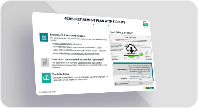 Enrollment & Account Access You can enroll in the plan, access your account, or get more information any time by: • Fidelity Online Enrollment Instructions • You will select Enroll and when prompted, enter the Plan ID: 50913 • Calling 800-343-0860 Monday through Friday from 8:30am – 8:30pm ET • View additional details on managing your account with Fidelity How much do you need to save for retirement? That depends on your expenses. Use this calculator from Fidelity to determine how much you should be saving now to be comfortable in your retirement. Read: What’s a 403(b)? Contributions Employees are eligible to contribute to this plan upon hire. Employees can opt to defer pre-tax or post-tax contributions. 403(B) RETIREMENT PLAN WITH FIDELITY FAQ Contributions You can contribute up to $24,500 into your 403(b) in 2026. If you’re age 50 or older, you can defer an additional $8,000 catch- up contribution through your bi-weekly payroll Eligibility You are eligible to contribute to the Plan upon hire. You may enter the plan at any time Plan Administrator Fidelity 20 // FY26 Benefit Guide