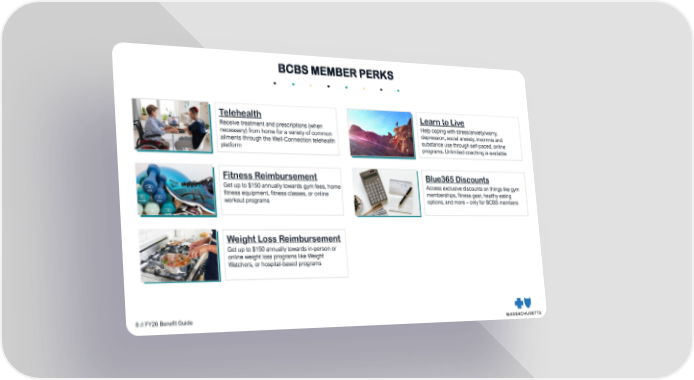 Telehealth Receive treatment and prescriptions (when necessary) from home for a variety of common ailments through the Well-Connection telehealth platform Learn to Live Help coping with stress/anxiety/worry, depression, social anxiety, insomnia and substance use through self-paced, online programs. Unlimited coaching is available Fitness Reimbursement Get up to $150 annually towards gym fees, home fitness equipment, fitness classes, or online workout programs Weight Loss Reimbursement Get up to $150 annually towards in-person or online weight loss programs like Weight Watchers, or hospital-based programs Blue365 Discounts Access exclusive discounts on things like gym memberships, fitness gear, healthy eating options, and more – only for BCBS members BCBS MEMBER PERKS 8 // FY26 Benefit Guide