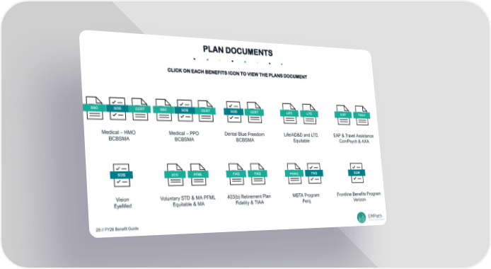 PLAN DOCUMENTS CLICK ON EACH BENEFITS ICON TO VIEW THE PLANS DOCUMENT Medical – HMO BCBSMA Medical – PPO BCBSMA Dental Blue Freedom BCBSMA Life/AD&D and LTD Equitable EAP & Travel Assistance ComPsych & AXA Vision EyeMed Voluntary STD & MA PFML Equitable & MA 403(b) Retirement Plan Fidelity & TIAA MBTA Program Perq Frontline Benefits Program Verizon SBC SOB SBC SOB SOB LIFE LTD EAP TRAV SOB STD PFML FAQ FAQ PERQ FAQ SUM CERT CERT CERT 29 // FY26 Benefit Guide