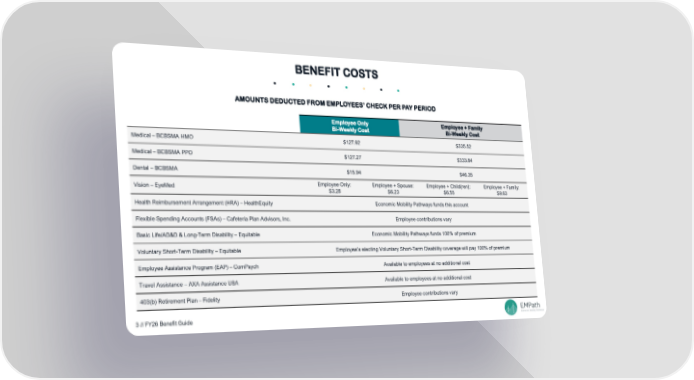 Employee Only Bi-Weekly Cost Employee + Family Bi-Weekly Cost Medical – BCBSMA HMO $127.92 $335.52 Medical – BCBSMA PPO $127.27 $333.84 Dental – BCBSMA $15.94 $46.35 Vision – EyeMed Employee Only: $3.28 Employee + Spouse: $6.23 Employee + Child(ren): $6.55 Employee + Family: $9.63 Health Reimbursement Arrangement (HRA) – HealthEquity Economic Mobility Pathways funds this account Flexible Spending Accounts (FSAs) – Cafeteria Plan Advisors, Inc. Employee contributions vary Basic Life/AD&D & Long-Term Disability – Equitable Economic Mobility Pathways funds 100% of premium Voluntary Short-Term Disability – Equitable Employee’s electing Voluntary Short-Term Disability coverage will pay 100% of premium Employee Assistance Program (EAP) – ComPsych Available to employees at no additional cost Travel Assistance – AXA Assistance USA Available to employees at no additional cost 403(b) Retirement Plan – Fidelity Employee contributions vary BENEFIT COSTS AMOUNTS DEDUCTED FROM EMPLOYEES’ CHECK PER PAY PERIOD 3 // FY26 Benefit Guide