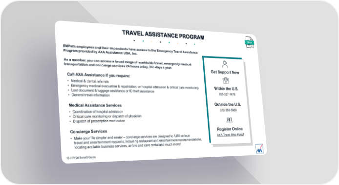 Get Support Now Register Online AXA Travel Web Portal Within the U.S. 855-327-1476 EMPath employees and their dependents have access to the Emergency Travel Assistance Program provided by AXA Assistance USA, Inc. As a member, you can access a broad range of worldwide travel, emergency medical transportation and concierge services 24 hours a day, 365 days a year. Call AXA Assistance if you require: • Medical & dental referrals • Emergency medical evacuation & repatriation, or hospital admission & critical care monitoring • Lost document & luggage assistance or ID theft assistance • General travel information Medical Assistance Services • Coordination of hospital admission • Critical care monitoring or dispatch of physician • Dispatch of prescription medication Concierge Services • Make your life simpler and easier – concierge services are designed to fulfill various travel and entertainment requests, including restaurant and entertainment recommendations, locating available business services, airfare and care rental and much more! TRAV TRAVEL ASSISTANCE PROGRAM Outside the U.S. 312-356-5980 15 // FY26 Benefit Guide