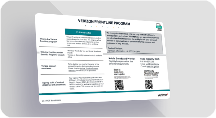 VERIZ VERIZON FRONTLINE PROGRAM We recognize the critical role you play on the front lines in emergencies and crises. Whether you are a part-time, full-time or volunteer first responder, the ability to use your personal device to communicate is paramount to the success and outcome of any mission. Contact Verizon: For more information, call 877-224-0348 PLAN DETAILS What is the Verizon Frontline program? Verizon Frontline is the advanced network for first responders on the front lines. This program offers first responders discounts and priority services on personal wireless devices, at no additional cost. With the First Responder Benefits Program, you get: *Wireless Priority Service and Mobile Broadband Priority *Access to discount programs to unlock exclusive offers Verizon account enrollment To be eligible, you must be the owner of the account to receive first responder discounts. Please view the Verizon Frontline Program Summary for instructions to get started. Agency point of contact (POC) for DHS enrollment Your agency POC must certify your status with DHS, part of the Cybersecurity and Infrastructure Security Agency (CISA). Enrollment for GETS or WPS is required for applicants regardless of your wireless carrier. This process can take up to two weeks. Voice eligibility CISA: Call 866-627-2255 E-mail [email protected] Or visit www.cisa.gov/pts Mobile Broadband Priority: Eligibility is dependent on data enrollment requirements. 23 // FY26 Benefit Guide