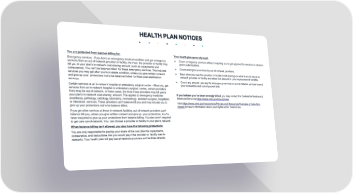You are protected from balance billing for: Emergency services - If you have an emergency medical condition and get emergency services from an out-of-network provider or facility, the most the provider or facility may bill you is your plan’s in-network cost-sharing amount (such as copayments and coinsurance). You can’t be balance billed for these emergency services. This includes services you may get after you’re in stable condition, unless you give written consent and give up your protections not to be balanced billed for these post-stabilization services. Certain services at an in-network hospital or ambulatory surgical center - When you get services from an in-network hospital or ambulatory surgical center, certain providers there may be out-of-network. In these cases, the most those providers may bill you is your plan’s in-network cost-sharing amount. This applies to emergency medicine, anesthesia, pathology, radiology, laboratory, neonatology, assistant surgeon, hospitalist, or intensivist services. These providers can’t balance bill you and may not ask you to give up your protections not to be balance billed. If you get other services at these in-network facilities, out-of-network providers can’t balance bill you, unless you give written consent and give up your protections. You’re never required to give up your protections from balance billing. You also aren’t required to get care out-of-network. You can choose a provider or facility in your plan’s network. When balance billing isn’t allowed, you also have the following protections: You are only responsible for paying your share of the cost (like the copayments, coinsurance, and deductibles that you would pay if the provider or facility was in- network). Your health plan will pay out-of-network providers and facilities directly. Your health plan generally must: Cover emergency services without requiring you to get approval for services in advance (prior authorization). Cover emergency services by out-of-network providers. Base what you owe the provider or facility (cost-sharing) on what it would pay an in- network provider or facility and show that amount in your explanation of benefits. Count any amount you pay for emergency services or out-of-network services toward your deductible and out-of-pocket limit. If you believe you’ve been wrongly billed, you may contact the Centers for Medicare & Medicaid Services https://www.cms.gov/nosurprises Visit https://www.cms.gov/nosurprises/Policies-and-Resources/Overview-of-rules-fact- sheets for more information about your rights under federal law. HEALTH PLAN NOTICES