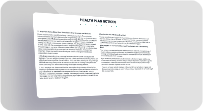 11. Important Notice About Your Prescription Drug Coverage and Medicare Please read this notice carefully and keep it where you can find it. This notice has information about your current prescription drug coverage with your employer and about your options under Medicare’s prescription drug coverage. This information can help you decide whether or not you want to join a Medicare drug plan. If you are considering joining, you should compare your current coverage, including which drugs are covered at what cost, with the coverage and costs of the plans offering Medicare prescription drug coverage in your area. Information about where you can get help to make decisions about your prescription drug coverage is at the end of this notice. There are two important things you need to know about your current coverage and Medicare’s prescription drug coverage: 1. Medicare prescription drug coverage became available in 2006 to everyone with Medicare. You can get this coverage if you join a Medicare Prescription Drug Plan or join a Medicare Advantage Plan (like an HMO or PPO) that offers prescription drug coverage. All Medicare drug plans provide at least a standard level of coverage set by Medicare. Some plans may also offer more coverage for a higher monthly premium. 2. Your employer has determined that the prescription drug coverage offered by the employer sponsored medical plans are, on average for all plan participants, expected to pay out as much as standard Medicare prescription drug coverage pays and are therefore considered Creditable Coverage. Because your existing coverage is Creditable Coverage, you can keep this coverage and not pay a higher premium (a penalty) if you later decide to join a Medicare drug plan. When Can You Join A Medicare Drug Plan? You can join a Medicare drug plan when you first become eligible for Medicare and each year from October 15th to December 7th. However, if you lose your current creditable prescription drug coverage, through no fault of your own, you will also be eligible for a two (2) month Special Enrollment Period (SEP) to join a Medicare drug plan. What Happens To Your Current Coverage If You Decide to Join A Medicare Drug Plan? Your current coverage pays for other health expenses, in addition to prescription drugs. If you are actively employed and decide to join a Medicare drug plan, your current medical coverage will not be affected; you can keep this coverage if you elect part D and this plan will coordinate with Part D coverage. If you are actively employed and you decide to join a Medicare drug plan and drop your current medical coverage, be aware that you and your dependents may be able to get this coverage back at the next open enrollment period or upon a qualifying status change if you remain otherwise eligible to enroll in the Plan. If you are no longer actively employed and you decide to join a Medicare drug plan and drop your current coverage, be aware that you and your dependents will not be able to get this coverage back. HEALTH PLAN NOTICES