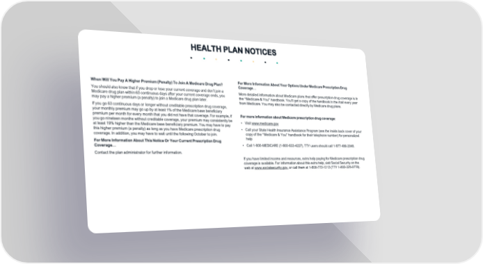 For More Information About Your Options Under Medicare Prescription Drug Coverage… More detailed information about Medicare plans that offer prescription drug coverage is in the “Medicare & You” handbook. You’ll get a copy of the handbook in the mail every year from Medicare. You may also be contacted directly by Medicare drug plans. For more information about Medicare prescription drug coverage: • Visit www.medicare.gov • Call your State Health Insurance Assistance Program (see the inside back cover of your copy of the “Medicare & You” handbook for their telephone number) for personalized help • Call 1-800-MEDICARE (1-800-633-4227). TTY users should call 1-877-486-2048. If you have limited income and resources, extra help paying for Medicare prescription drug coverage is available. For information about this extra help, visit Social Security on the web at www.socialsecurity.gov, or call them at 1-800-772-1213 (TTY 1-800-325-0778). When Will You Pay A Higher Premium (Penalty) To Join A Medicare Drug Plan? You should also know that if you drop or lose your current coverage and don’t join a Medicare drug plan within 63 continuous days after your current coverage ends, you may pay a higher premium (a penalty) to join a Medicare drug plan later. If you go 63 continuous days or longer without creditable prescription drug coverage, your monthly premium may go up by at least 1% of the Medicare base beneficiary premium per month for every month that you did not have that coverage. For example, if you go nineteen months without creditable coverage, your premium may consistently be at least 19% higher than the Medicare base beneficiary premium. You may have to pay this higher premium (a penalty) as long as you have Medicare prescription drug coverage. In addition, you may have to wait until the following October to join. For More Information About This Notice Or Your Current Prescription Drug Coverage… Contact the plan administrator for further information. HEALTH PLAN NOTICES