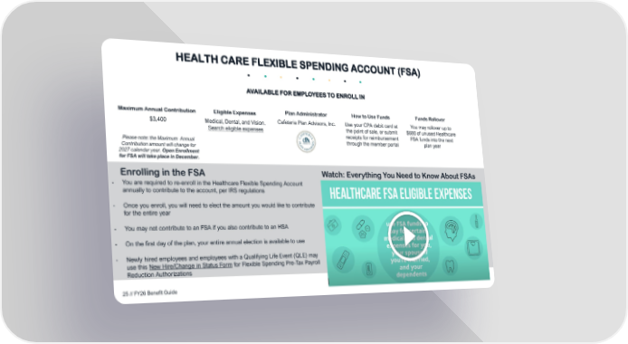 Enrolling in the FSA Watch: Everything You Need to Know About FSAs - You are required to re-enroll in the Healthcare Flexible Spending Account annually to contribute to the account, per IRS regulations - Once you enroll, you will need to elect the amount you would like to contribute for the entire year - You may not contribute to an FSA if you also contribute to an HSA - On the first day of the plan, your entire annual election is available to use - Newly hired employees and employees with a Qualifying Life Event (QLE) may use this New Hire/Change in Status Form for Flexible Spending Pre-Tax Payroll Reduction Authorizations Maximum Annual Contribution $3,400 Please note: the Maximum Annual Contribution amount will change for 2027 calendar year. Open Enrollment for FSA will take place in December. Eligible Expenses Medical, Dental, and Vision. Search eligible expenses How to Use Funds Use your CPA debit card at the point of sale, or submit receipts for reimbursement through the member portal Funds Rollover You may rollover up to $680 of unused Healthcare FSA funds into the next plan year Plan Administrator Cafeteria Plan Advisors, Inc. HEALTH CARE FLEXIBLE SPENDING ACCOUNT (FSA) AVAILABLE FOR EMPLOYEES TO ENROLL IN 25 // FY26 Benefit Guide