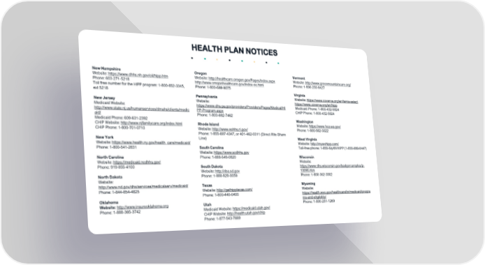 New Hampshire Website: https://www.dhhs.nh.gov/oii/hipp.htm Phone: 603-271-5218 Toll free number for the HIPP program: 1-800-852-3345, ext 5218 New Jersey Medicaid Website: http://www.state.nj.us/humanservices/dmahs/clients/medic aid/ Medicaid Phone: 609-631-2392 CHIP Website: http://www.njfamilycare.org/index.html CHIP Phone: 1-800-701-0710 New York Website: https://www.health.ny.gov/health_care/medicaid/ Phone: 1-800-541-2831 North Carolina Website: https://medicaid.ncdhhs.gov/ Phone: 919-855-4100 North Dakota Website: http://www.nd.gov/dhs/services/medicalserv/medicaid/ Phone: 1-844-854-4825 Oklahoma Website: http://www.insureoklahoma.org Phone: 1-888-365-3742 Vermont Website: http://www.greenmountaincare.org/ Phone: 1-800-250-8427 Virginia Website: https://www.coverva.org/en/famis-select https://www.coverva.org/en/hipp Medicaid Phone: 1-800-432-5924 CHIP Phone: 1-800-432-5924 Washington Website: https://www.hca.wa.gov/ Phone: 1-800-562-3022 West Virginia Website: http://mywvhipp.com/ Toll-free phone: 1-855-MyWVHIPP (1-855-699-8447) Wisconsin Website: https://www.dhs.wisconsin.gov/badgercareplus/p- 10095.htm Phone: 1-800-362-3002 Wyoming Website: https://health.wyo.gov/healthcarefin/medicaid/progra ms-and-eligibility/ Phone: 1-800-251-1269 Oregon Website: http://healthcare.oregon.gov/Pages/index.aspx http://www.oregonhealthcare.gov/index-es.html Phone: 1-800-699-9075 Pennsylvania Website: https://www.dhs.pa.gov/providers/Providers/Pages/Medical/HI PP-Program.aspx Phone: 1-800-692-7462 Rhode Island Website: http://www.eohhs.ri.gov/ Phone: 1-855-697-4347, or 401-462-0311 (Direct RIte Share Line) South Carolina Website: https://www.scdhhs.gov Phone: 1-888-549-0820 South Dakota Website: http://dss.sd.gov Phone: 1-888-828-0059 Texas Website: http://gethipptexas.com/ Phone: 1-800-440-0493 Utah Medicaid Website: https://medicaid.utah.gov/ CHIP Website: http://health.utah.gov/chip Phone: 1-877-543-7669 HEALTH PLAN NOTICES