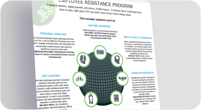 EMPLOYEE ASSISTANCE PROGRAM Financial worries, aging parents, job stress, health issues - Everyone faces challenges from time to time, with your EAP you don't have to face these things alone. This includes solutions such as: ANYTIME, ANYWHERE Reducing barriers to access through technology INCLUDES: 24/7/365 Telephone Support, Mobile App with chat functionality, Video PERSONAL ASSISTANT MENTAL HEALTH COUNSELING Counseling and Web Portal Our Personal Assistant helps individuals with their When overwhelmed with personal, work or "to do" list. It can be difficult to find extra time in the life stressors, mental health counseling can day to manage everyday tasks. We help lighten the be a lifesaver. Our licensed master's level load through researching the best options to counselors support you and your household benefit you and your loved ones. members through difficult times providing SERVICES INCLUDE: Entertainment & Dining, confidential assistance 24/7. Travel & Tourism, Household Errands, Service WE HELP WITH: Family Conflict, Professionals Couples/Relationships, Substance Abuse, Anxiety, Depression WORK/LIFE RESOURCES LIFE COACHING Navigating the practical challenges of We help employees and their household life, while handling the demands of members meet their personal and your job can be stressful. Work/Life professional goals. A life coach works resources and referral services are actively to help individuals asses their designed to provide knowledgeable current situation then develop goals and consultation and customized guidance action steps to meet their stated to assist with gaining resolution to expectations. A coach is accountability everyday hurdles. partner and helps individuals overcome RESOURCES INCLUDE: Adoption, obstacles to achieve their goals. Elder/Adult Care, Parenting, Child WE HELP WITH: Life Transitions, Care, Special Needs Support, Creating Better Work/Life Balance, Setting Wellness Goals, Improving relationships MEDICAL ADVOCACY LEGAL/FINANCIAL RESOURCES Medical Advocacy is a new approach to maneuvering through the Legal and Financial resources and referrals are available to healthcare system. It offers strategies to promote employee health, connect employees with experienced, vetted professionals in productivity, and well-being by serving patient populations throughout the their topical area of legal and financial needs. entire lifespan and by addressing health problems in every category of RESOURCES INCLUDE: Divorce/Custody, Bankruptcy, disease classification and in all disease stages. Budgeting, Estate Planning/Wills, Personal Injury/Malpractice, WE HELP WITH: Insurance Navigation, Doctor Referrals, Specialist Major Life Event Planning Referrals, Care Transition, Discharge Planning, Adult Care Coach PRIVATE, CONFIDENTIAL & FREE FOR YOU AND YOUR HOUSEHOLD MEMBERS Your participation with your EAP is voluntary and strictly confidential. We do not report back to your employer about the things you discuss in private counseling conversations.
