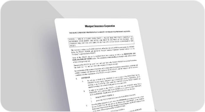 INSURANCE INDUSTRY PROFESSIONAL LIABILITY COVERAGE FOR INSURANCE AGENCIES NOTICE — THIS IS A CLAIMS MADE POLICY — PLEASE READ THIS POLICY CAREFULLY TO DETERMINE YOUR RIGHTS AND DUTIES AND WHAT IS AND WHAT IS NOT COVERED. THE COMPANY WILL NOT PAY ANY AMOUNTS OR TAKE ANY ACTION EXCEPT AS PROVIDED IN THIS POLICY. This insurance is written on a CLAIMS made basis and applies only to CLAIMS first made against the INSURED during the POLICY PERIOD and reported to Westport Insurance Corporation (hereafter referred to as the "Company") as provided in the POLICY. Terms of this POLICY that are in capitalized letters have meanings set forth in the DEFINITIONS AND EXPLANATION OF TERMS section. The capitalized and bolded headings are descriptive only and do not create or limit coverage in any way. Throughout this POLICY the words "you" and "your" refer to the NAMED INSURED shown in the Declarations. The words "we," "us" and "our" refer to the company providing the insurance. In consideration of the payment of premium, and in reliance upon the statements, representations, attachments and exhibits contained and submitted with the application for this POLICY, and also subject to all the exclusions, conditions and other requirements of this POLICY, we agree as follows: I. COVERAGE A. We will pay on behalf of the INSURED all sums in excess of the DEDUCTIBLE that the INSURED becomes legally obligated to pay as DAMAGES caused by WRONGFUL ACTS resulting in any CLAIM first made against the INSURED during the POLICY PERIOD and reported in writing to us or the producing agent as soon as practicable. B. In order to be covered by this POLICY, a CLAIM must seek DAMAGES arising from a WRONGFUL ACT committed either by the INSURED, or by a person for whose WRONGFUL ACTS the INSURED is legally liable, and such WRONGFUL ACT must take place: 1. during the POLICY PERIOD; or 2. prior to the POLICY PERIOD but on or after the RETROACTIVE DATE. C. Notwithstanding paragraphs A. or B. above, this COVERAGE section does not provide coverage for any CLAIM, if at the time prior to the effective date of this POLICY, or any Employers Reinsurance Corporation or Westport Insurance Corporation policy this POLICY replaces, if you or any owner, officer or partner of the NAMED INSURED: 1. knew of a CLAIM or POTENTIAL CLAIM; or 2. with regard to a BREACH of PERSONAL DATA, was aware of such BREACH. D. ADDITIONAL COVERAGES 1. CATASTROPHE EXTRA EXPENSE. We will pay up to $25,000 per catastrophe subject to a per POLICY PERIOD aggregate limit of $50,000 for the actual extra expenses incurred by you as a result of a catastrophe during the POLICY PERIOD beginning on the date of a catastrophe and for thirty (30) days thereafter. The extra expense incurred must be incurred by you only to assist in the insurance claims processing needs of your customer(s) who have been affected by the catastrophe. The catastrophe must be a declared catastrophe by the Property Claims Services. A $500 deductible for each catastrophe shall apply. Limits provided by this paragraph are part of and not in addition to the limits provided by this POLICY. SP 4 584 1215 Copyright ©2015 Westport Insurance Corporation. All rights reserved. Page 1 of 15 Insured Copy