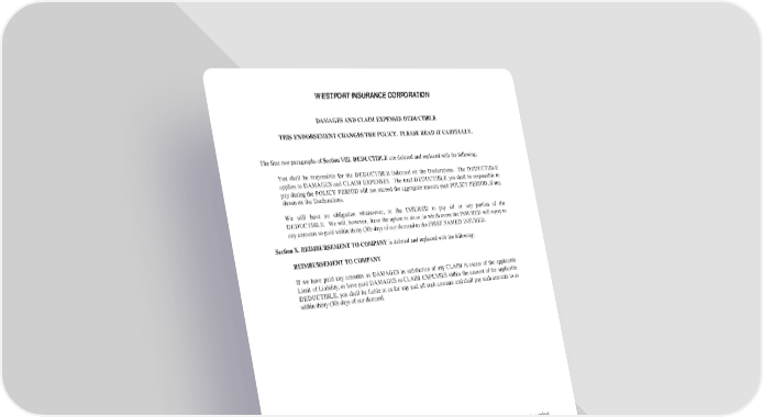 WESTPORT INSURA NCE CORPORATION DAMAGES AND CLAIM EXPENSES DEDUCTIBLE THIS ENDORSEMENT CHANGES THE POLICY. PLEASE READ IT CAREFULLY. The first two paragraphs of Section VIII. DEDUCTIBLE are deleted and replaced with the following: You shall be responsible for the DEDUCTIBLE indicated on the Declarations. The DEDUCTIBLE applies to DAMAGES and CLAIM EXPENSES. The total DEDUCTIBLE you shall be responsible to pay during the POLICY PERIOD will not exceed the aggregate amount each POLICY PERIOD, if any, shown on the Declarations. We will have no obligation whatsoever, to the INSURED to pay all or any portion of the DEDUCTIBLE. We will, however, have the option to do so, in which event the INSURED will repay us any amounts so paid within thirty (30) days of our demand to the FIRST NAMED INSURED. Section X. REIMBURSEMENT TO COMPANY is deleted and replaced with the following: REIMBURSEMENT TO COMPANY If we have paid any amounts as DAMAGES in satisfaction of any CLAIM in excess of the applicable Limit of Liability, or have paid DAMAGES or CLAIM EXPENSES within the amount of the applicable DEDUCTIBLE, you shall be liable to us for any and all such amounts and shall pay such amounts to us within thirty (30) days of our demand. All other terms and conditions of this policy shall remain unchanged. This endorsement forms a part of the policy to which attached, effective on the inception date of the policy unless otherwise stated herein. (The information below is required only when this endorsement is issued subsequent to the preparation of the policy.) Endorsement Effective 05-01-17 Policy No. WED4MA010028207 Named Insured EBS INSURANCE BROKERS, INC. WESTPORT INSURANCE CORPORATION Countersigned. Authorized Representative President Secretary SP 000 244 0112 Page 1 of 1 Insured Copy