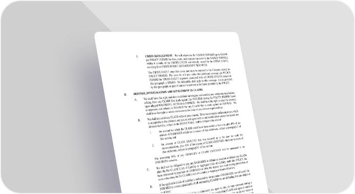 5. CRISIS MANAGEMENT. We will reimburse the NAMED INSURED up to $20,000 per POLICY PERIOD for fees, costs, and expenses incurred by the NAMED INSURED within 6 months of the CRISIS EVENT and directly caused by the CRISIS EVENT, resulting from CRISIS EVENT MANAGEMENT SERVICES. The CRISIS EVENT must first occur and must be reported to the Company during the POLICY PERIOD. The most we will pay under this additional coverage per POLICY PERIOD for CRISIS EVENT expenses associated with all CRISIS EVENTS subject to this paragraph is $20,000. No deductible shall apply to this coverage. Limits provided by this paragraph are part of and not in addition to the limits provided by the POLICY. II. DEFENSE, INVESTIGATION AND SETTLEMENT OF CLAIMS A. We shall have the right and duty to defend, investigate, and conduct any settlement negotiations arising from any CLAIM first made against the INSURED during the POLICY PERIOD based upon alleged WRONGFUL ACTS of an INSURED. We shall have the right to select the attorney to represent and defend an INSURED for any CLAIM that is made against an INSURED. We shall have the right to select arbitrators in the event of any arbitration proceedings. B. We shall not settle any CLAIM without your consent. If we recommend a settlement to you which is acceptable to the claimant, and you do not agree with us and would rather contest the matter, our ultimate liability, subject to the DEDUCTIBLE, will be limited to the total of: 1. the amount for which the CLAIM could have been settled at that time, plus 40% of the amount of DAMAGES which are in excess of that settlement, subject to paragraph C of this section, and 2. the amount of CLAIM EXPENSE that was incurred up to the time we made the recommendation, plus 40% of the amount of CLAIM EXPENSES which are in excess of that settlement, subject to paragraph C of this section. The remaining 60% of any DAMAGES or CLAIM EXPENSES will be uninsured at the INSURED'S own risk. C. We shall not be obligated to pay any DAMAGES or defend or continue to defend any CLAIM after the Per CLAIM Limit of Liability or Aggregate Limit of Liability under this POLICY has been exhausted by payment of DAMAGES or after the deposit in a court having jurisdiction of sums exhausting the Per CLAIM Limit of Liability or Aggregate Limit of Liability. D. If the applicable Limit of Liability is exhausted by the payment of DAMAGES, we will notify the INSURED as soon as practicable of all outstanding CLAIMS we are defending that are subject to such limit. E. If the applicable Limit of Liability is exhausted, we agree to take all steps necessary during a transfer of control of defense to the INSURED of any outstanding CLAIM and agree to continue that defense during such transfer. When we take such steps, you agree that we do not waive or relinquish any of our rights under the POLICY. We agree to pay up to $10,000 in reasonable CLAIM EXPENSES incurred by us during such transfer, after the applicable Limit of Liability has been exhausted. Any additional CLAIM EXPENSES will be the responsibility of the INSURED. III. REPORTING AND NOTICE INSURED’S duties in the event of any CLAIM or any POTENTIAL CLAIM: A. The INSURED shall not without our written consent, do any of the following: 1. admit liability; 2. participate in any settlement discussions nor enter into any settlement; 3. incur any cost or expenses; or 4. produce documents, provide a recorded statement, or give any deposition regarding any actual or alleged WRONGFUL ACT. SP 4 584 1215 Copyright ©2015 Westport Insurance Corporation. All rights reserved. Page 3 of 15 Insured Copy