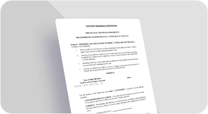 WESTPORT INSURA NCE CORPORATION PREPAID LEGAL EXPENSE PLAN ENDORSEMENT THIS ENDORSEMENT CHANGES THE POLICY. PLEASE READ IT CAREFULLY. Section IV, DEFINITIONS AND EXPLANATIONS OF TERMS, K. OTHER RELATED SERVICES is amended to add the following: 1. soliciting applications of prospective clients for prepaid legal expense plans governed by a General Agency Agreement with an entity listed in the Schedule below; 2. evaluating client applications, gathering and obtaining client information, forwarding applications for prepaid legal expense plans as required by a General Agency Agreement with an entity listed in the Schedule below; 3. distributing marketing materials approved by an entity listed in the Schedule below whose products are promoted by such marketing materials; and 4. servicing and administration relat ed to the sale of prepaid legal expense plans governed by a General Agency Agreement with an entity listed in the Schedule below. SCHEDULE Name of Entity With Whom You Have a General Agency Agreement Address PREPAID LEGAL SERVICES, INC. For the purposes of this endorsement only, Section V., EXCLUSIONS is amended to add the following exclusions: LAWYERS PROFESSIONAL LIABILITY. Or in connection with professional acts, errors or omissions of any lawyer or any person for whose acts such lawyer is legally responsible. SCHEDULE. The marketing, sale, servicing or administration of any prepaid legal expense plans other than those offered that are subject to a General Agency Agreement with an entity listed in the Schedule above. Endorsement RETROACTIVE DATE: Additional Premium: $ 186 All other terms and conditions of this policy shall remain unchanged. This endorsement forms a part of the policy to which attached, effective on the inception date of the policy unless otherwise stated herein. (The information below is required only when this endorsement is issued subsequent to the preparation of the policy.) Endorsement Effective 05-01-17 Policy No. WED4MA010028207 Named Insured EBS INSURANCE BROKERS, INC. WESTPORT INSURANCE CORPORATION Countersigned. Authorized Representative President Secretary SP 000 259 0610 Page 1 of 1 Insured Copy