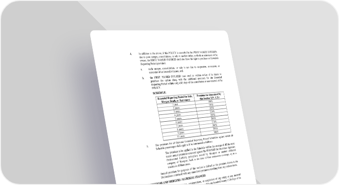 4. In addition to the above, if this POLICY is canceled by the FIRST NAMED INSURED, due to your merger, consolidation, or sale to another entity, or death or retirement of the owner, the FIRST NAMED INSURED shall also have the right to purchase an Extended Reporting Period provided: a. such merger, consolidation, or sale is not due to suspension, revocation, or surrender of an insured’s license; and b. the FIRST NAMED INSURED must send us written notice of its intent to purchase the option along with the additional premium for the Extended Reporting Period within sixty (60) days of the cancellation or non-renewal of the POLICY. SCHEDULE: Extended Reporting Period for Sale, Premium (as determined by Merger, Death, or Retirement this Section XIV. C.5.) 1 year 100% 2 years 150% 3 years 185% 4 years 220% 5 years 250% 6 years 260% 7 years 270% 8 years 280% 9 years 290% 10 years 300% 5. The premium for all Optional Extended Reporting Period Schedules against which all Schedule percentages shall apply will be determined as follows: The premium to be applied in the Schedule will be the average of all the most recent annual premiums assessed against the INSURED for Insurance Agencies Professional Liability policy(ies) issued by Westport or another affiliated company of Westport, back to the date of first continuous coverage, up to a maximum of three years. Annual premium for purposes of this section is defined as the premium shown in the Declarations combined with any annualized premiums resulting from any endorsements. XV. ACQUISITIONS AND MERGERS / MATERIAL CHANGES In the event of any merger, consolidation, amalgamation, or acquisition of any entity or any material change in your operations, you shall notify us of such change within one-hundred twenty (120) days of the date of such change. XVI. MULTIPLE INSUREDS AND CLAIMANTS The inclusion of more than one INSURED in any CLAIM or the making of CLAIMS by more than one person or organization shall not increase the Limits of Liability or the DEDUCTIBLE. Two or more CLAIMS arising out of a single WRONGFUL ACT, or a series of related or continuing WRONGFUL ACTS, shall be a single CLAIM. All such CLAIMS, whenever made, shall be considered first made on the date on which the earliest CLAIM was first made arising out of such WRONGFUL ACT, and all such CLAIMS are subject to one Per CLAIM Limit of Liability and DEDUCTIBLE. XVII. LIBERALIZATION If, during the POLICY PERIOD we adopt revised provisions for this POLICY in order to afford, without additional premium, broader insurance to all INSUREDS covered by this POLICY, such provision will apply to this POLICY effective the date the provision has been approved by the appropriate regulatory authority and such revision shall apply only to CLAIMS first made, or POTENTIAL CLAIMS of which you first become aware, after the date of such approval. SP 4 584 1215 Copyright ©2015 Westport Insurance Corporation. All rights reserved. Page 14 of 15 Insured Copy