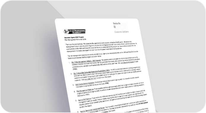 Insurance Agency E&O Program Risk Management Reference Guide Thank you for your business. We appreciate the opportunity to serve as your professional liability carrier. We believe risk management is key in not only preventing errors, but also in providing agencies with tools to more efficiently service customers. As a policyholder of the IIABA and Swiss Re Corporate Solutions professional liability program you have exclusive access to the risk management information developed from our more than 30 years of experience insuring agencies. The risk management resources exclusively available to your agency as a valued policyholder of the IIABA and Swiss Re Corporate Solutions professional liability program are shown below: 1. Big "I" Risk Management Website --- E&O Happens: The website contains comprehensive information and tools such as: the common mistakes that cause E&O claims, real-life case studies for learning, best practice tips, sample disclaimers, procedures and client letters, operational self-assessments, E&O-related articles, and more. Visit www.iiaba.net/EOhappens to login. (FREE) 2. Big "I’ Virtual Risk Consultant Powered by Rough Notes ("VRC"): The VRC is a web-based resource providing comprehensive tools such as industry specific client risk exposure questionnaires and checklists to better understand the coverage needs of customers and assist the agency in avoiding E&O claims from failing to offer proper coverage and failing to identify customer exposure. Visit www.iiaba.net/VRC to learn more. (Fee-based) 3. E&O Claims Advisor Newsletter: Published periodically and emailed to agency staff, this newsletter provides valuable information on agency E&O trends and hot topics. (FREE) 4. Risk Management Webinars: These quarterly webinars address emerging E&O risk management topics. Less than an hour in length and perfect for all agency staff, the webinars include detailed discussion from industry experts on reducing exposure to E&O claims. (FREE) 5. Agency E&O Seminar: Presented by the IIABA state associations, E&O seminars are the basic foundation of agency E&O risk management and is an excellent way to introduce agency E&O risk management to agency personnel. Agencies with the requisite number of staff attending may qualify for a 10% premium credit and may also qualify for CE credits providing a double benefit. (Fee-based) 6. Agency Operational Improvement Review: You may want an experienced external eye to review your agency operation and assist with the implementation of improvements. Voluntary completion of this review may qualify you for a 10% E&O premium credit good for three years on the next renewal. (Fee-based) 7. Big "I" Virtual University: In addition to a website with information on hundreds of insurance related business and technology articles, sample ISO forms, white papers and information affecting today’s insurance marketplace, it also provides a forum to answer questions that can’t otherwise be found in the research library through the "Ask An Expert". Visit www.iiaba.net/vu to login. (Free) 8. Big "I" Agents Council for Technology ("ACT"): ACT brings agents, carriers, vendors, user groups and industry associations together in an effort to employ the best workflows and technologies available within the Independent Agency System order to improve our competitive edge. Please visit the ACT website at www.iiaba.net/act and watch the short video briefing on the site to get a good overview of the high quality information that we make available to agents and carriers. Should you have any questions, please contact your state association or visit www.iiaba.net/eohappens. We appreciate your continued support of the IIABA and Swiss Re Corporate Solutions Professional Liability Program and hope you find these risk management resources useful in helping your agency avoid E&O claims. Insurance products underwritten by Westport Insurance Corporation, Overland Park, Kansas, a member of Swiss Re Corporate Solutions. Insured Copy