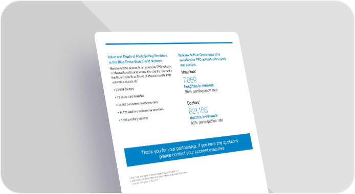 Value and Depth of Participating Providers Nationwide Blue Cross plans offer in the Blue Cross Blue Shield Network an extensive PPO network of hospitals Members have access to an extensive PPO network and doctors. in Massachusetts and across the country. Currently 2 Hospitals the Blue Cross Blue Shield of Massachusetts PPO 1 network consists of: 7, 8 6 9 • 23,969 doctors hospitals in-network • 73 acute care hospitals 96% participation rate • 11,692 behavioral health providers 2 Doctors • 14,123 ancillary professional providers 821,166 • 1,795 ancillary facilities doctors in-network 93% participation rate Thank you for your partnership. If you have any questions please contact your account executive. 1. Blue Cross Blue Shield of Massachusetts data, as of August 2017 2. Blue Cross Blue Shield Association data and Consortium Health Plan Network Compare Findings as of May 2015 Blue Cross Blue Shield of Massachusetts complies with applicable federal ATENCIÓN: Si habla español, tiene a su disposición servicios gratuitos civil rights laws and does not discriminate on the basis of race, color, de asistencia con el idioma. Llame al número de Servicio al Cliente que national origin, age, disability, sex, sexual orientation or gender identity. 昀椀gura en su tarjeta de identi昀椀cación (TTY: 711). ATTENTION: If you don’t speak English, language assistance services, free ATENÇÃO: Se fala português, são-lhe disponibilizados gratuitamente of charge, are available to you. Call Member Services at the number serviços de assistência de idiomas. Telefone para os Serviços aos on your ID Card (TTY: 711). Membros, através do número no seu cartão ID (TTY: 711). ® Registered Marks of the Blue Cross and Blue Shield Association. © 2017 Blue Cross and Blue Shield of Massachusetts, Inc., and Blue Cross and Blue Shield of Massachusetts HMO Blue, Inc. 175891M (10/17)