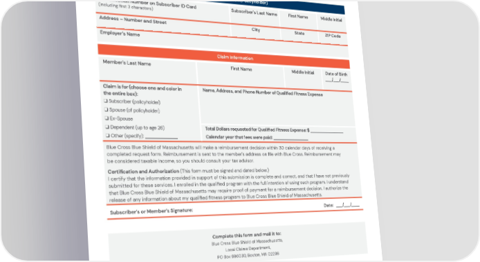 Fitness Reimbursement Request Please print all information clearly. To verify that this reimbursement is offered within your plan, or for more information, you can sign in to MyBlue at bluecrossma.org or call the Member Service number on your ID card. All fitness reimbursement requests must be submitted by March 31 of the following year. Subscriber Information (Policyholder) Identification Number on Subscriber ID Card Subscriber's Last Name First Name Middle Initial (including first 3 characters) Address – Number and Street City State ZIP Code Employer’s Name Claim Information Member's Last Name First Name Middle Initial Date of Birth ___/___/____ Claim is for (choose one and color in Name, Address, and Phone Number of Qualified Fitness Expense the entire box): q Subscriber (policyholder) q Spouse (of policyholder) q Ex-Spouse q Dependent (up to age 26) Total Dollars requested for Qualified Fitness Expense: $ ________________ q Other (specify): _____________ Calendar year that fees were paid: ________________ Blue Cross Blue Shield of Massachusetts will make a reimbursement decision within 30 calendar days of receiving a completed request form. Reimbursement is sent to the member's address on file with Blue Cross. Reimbursement may be considered taxable income, so you should consult your tax advisor. Certification and Authorization (This form must be signed and dated below.) I certify that the information provided in support of this submission is complete and correct, and that I have not previously submitted for these services. I enrolled in the qualified program with the full intention of using such program. I understand that Blue Cross Blue Shield of Massachusetts may require proof of payment for a reimbursement decision. I authorize the release of any information about my qualified fitness program to Blue Cross Blue Shield of Massachusetts. Subscriber’s or Member’s Signature: Date: ___/___/____ Complete this form and mail it to: Blue Cross Blue Shield of Massachusetts, Local Claims Department, PO Box 986030, Boston, MA 02298 Blue Cross Blue Shield of Massachusetts complies with applicable federal civil rights laws and does not discriminate on the basis of race, color, national origin, age, disability, sex, sexual orientation, or gender identity. ATTENTION: If you don’t speak English, language assistance services, free of charge, are available to you. Call Member Service at the number on your ID card (TTY: 711). ATENCIÓN: Si habla español, tiene a su disposición servicios gratuitos de asistencia con el idioma. Llame al número de Servicio al Cliente que figura en su tarjeta de identificación (TTY: 711). ATENÇÃO: Se fala português, são-lhe disponibilizados gratuitamente serviços de assistência de idiomas. Telefone para os Serviços aos Membros, através do número no seu cartão ID (TTY: 711). Blue Cross Blue Shield of Massachusetts is an Independent Licensee of the Blue Cross and Blue Shield Association. ® Registered Marks of the Blue Cross and Blue Shield Association. 001101250 (8/21) ®´ Registered Marks and TM Trademarks are the property of their respective owners. © 2021 Blue Cross and Blue Shield of Massachusetts, Inc., or Blue Cross and Blue Shield of Massachusetts HMO Blue, Inc.