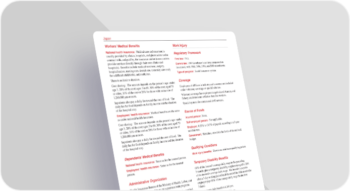 Japan Workers’ Medical Benefits Work Injury National health insurance: Medical care and treatment is Regulatory Framework usually provided by clinics, hospitals, and pharmacists under contract with, and paid by, the insurance carrier (some carriers First law: 1911. provide services directly through their own clinics and Current law: 1947 (workmen’s accident compensation hospitals). Benefits include medical treatment, surgery, insurance), with 1980, 1986, 1995, and 2000 amendments. hospitalization, nursing care, dental care, maternity care (only Type of program: Social insurance system. for a difficult childbirth), and medicines. There is no limit to duration. Coverage Cost sharing: The amount depends on the person’s age: under age 3, 20% of the cost; ages 3 to 69, 30% of the cost; aged 70 Employees of all firms in industry and commerce not included or older, 10% of the cost or 20% for those with an income of under voluntary coverage or special schemes. 1,240,000 yen or more. Voluntary coverage for employees in agricultural, forestry, and Inpatients also pay a daily fee toward the cost of food. The fishery establishments with less than five workers. daily fee for food depends on family income and the duration Special systems for seamen and civil servants. of the hospital stay. Employees’ health insurance: Medical benefits are the same Source of Funds as under national health insurance. Cost sharing: The amount depends on the person’s age: under Insured person: None. age 3, 20% of the cost; ages 3 to 69, 30% of the cost; aged 70 Self-employed person: Not applicable. or older, 10% of the cost or 20% for those with an income of Employer: 0.55% to 13.5% of payroll, according to a 3-year 1,240,000 yen or more. accident rate. Inpatients also pay a daily fee toward the cost of food. The Government: Subsidies, set within the limits of the national daily fee for food depends on family income and the duration budget. of the hospital stay. Dependents’ Medical Benefits Qualifying Conditions National health insurance: Same as for the insured person. Work injury benefits: There is no minimum qualifying period. Employees’ health insurance: Same as for the insured Temporary Disability Benefits person. 60% of the insured’s average daily wage in the preceding Administrative Organization 3 months plus a temporary disability supplement equal to 20% of the insured’s average daily wage. The benefit is payable Health Insurance Bureau of the Ministry of Health, Labor, and after a 3-day waiting period until the end of the 18th month (the Welfare (http://www.mhlw.go.jp) supervises both programs. employer pays 60% of the average daily wage for the first National health insurance: Local administration is provided 3 days). mainly by municipal health insurance funds. The National The minimum daily benefit is 4,160 yen. Health Insurance societies provide administration for some The maximum daily benefit is 23,620 yen. insured persons, including the self-employed. National Health Benefit adjustment: Automatic quarterly adjustment for wage Insurance provides medical benefits. changes higher than 10% from the previous quarter. Employees’ health insurance: Social Insurance Agency From the 19th month, less severely disabled persons receive (http://www.sia.go.jp) provides the national administration for the same level of benefit as before until recovery; more the government-managed program. Regional Social Insurance severely disabled persons receive the injury and disease Bureaus and Social Insurance Offices administer the program compensation pension (annual benefit is equal to 100% of the locally. Employees’ Health Insurance provides cash and average daily wage in the preceding 3 months multiplied by medical benefits. For programs managed by Health Insurance between 245 and 313 days until recovery, according to the Societies, insurance divisions of prefecture departments and degree of disability), plus a special supplement based on the 1,756 Health Insurance Societies provide local administration worker’s annual salary bonus. for affiliated workers. Benefits are paid every 2 months. Benefit adjustment: Automatic annual adjustment for wage changes.