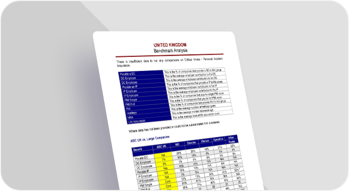 UNITED KINGDOM Benchmark Analysis There is insufficient data to run any comparisons on Critical Illness / Personal Accident Insurance. Provide a DC This is the % of companies that provide a DC to this group DC Employer This is the average employer contribution to the DC DC Employee This is the average employee contribution to the DC Provide an IP This is the % of companies that provide a IP to this group IP Employer This is the average employer contribution to the IP IP Employee This is the average employee contribution to the IP PMI Single This is the % of companies that pay for single PMI cover PMI Full This is the % of companies that pay for full PMI cover PHI This is the % of companies that provide PHI to this group Holidays This is the average number of holidays given NRA This is the average normal retirement age Life Assurance This is the average level of life assurance cover Where data has not been provided or could not be substantiated N/A is entered. ABC UK vs. Large Companies Benefit ABC UK MD Director Clerical Operative Other Ranks Provide DC Yes 26% 26% 10% 31% 22% DC Employer 7% 10% 10% 4% 5% 4% DC Employee 5% 5% 5% 6% 6% 6% Provide IP Yes 14% 14% N/A N/A N/A IP Employer N/A 10% 10% N/A N/A N/A IP Employee N/A 5% 5% N/A N/A N/A PMI Single Core 13% 13% 54% 45% 82% * PMI Full Core 81% 81% N/A N/A N/A PHI Yes 88% 77% 45% 19% 54% Holidays N/A 25 25 20 25 25 NRA 65 61 61 N/A N/A N/A Life Assurance 4 x DIS 4 x DIS 4 x DIS 3 x DIS 3 x DIS 4 x DIS * This is a lower level of PMI to the others, the majority being based on a cash plan scheme rather than a structured PMI scheme. ABC UK Ltd Page C - 7