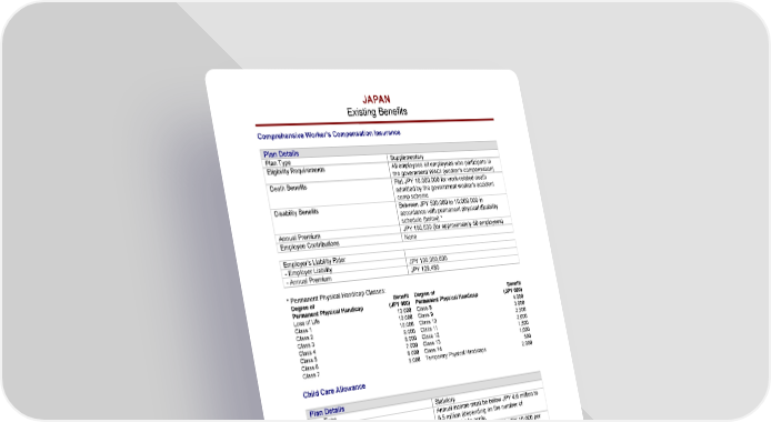 JAPAN Existing Benefits Comprehensive Worker’s Compensation Insurance Plan Details Plan Type Supplementary Eligibility Requirements All employees all employees who participate in the government WACI (worker’s compensation) Death Benefits Flat JPY 10,000,000 for work-related death admitted by the government worker’s accident comp scheme Disability Benefits Between JPY 500,000 to 10,000,000 in accordance with permanent physical disability schedule (below) * Annual Premium JPY 180,030 (for approximately 50 employees) Employee Contributions None Employer’s Liability Rider - Employer Liability JPY 100,000,000 - Annual Premium JPY 129,480 * Permanent Physical Handicap Classes: Degree of Benefit Degree of Benefit Permanent Physical Handicap (JPY 000) Permanent Physical Handicap (JPY 000) Loss of Life 10,000 Class 8 4,000 Class 1 10,000 Class 9 3,000 Class 2 10,000 Class 10 2,500 Class 3 9,000 Class 11 2,000 Class 4 8,000 Class 12 1,500 Class 5 7,000 Class 13 1,000 Class 6 6,000 Class 14 500 Class 7 5,000 Temporary Physical Handicaps 2,000 Child Care Allowance Plan Details Plan Type Statutory Eligibility Requirements Annual income must be below JPY 4.6 million to 6.5 million (depending on the number of dependents) to apply. Statutory Benefits JPY 5,000 per month per child (JPY 10,000 per month for the third child +) is provided until March 31 following the 9th birthday of the child. Additional Benefits None Premium 0.09% of total remuneration Employee Contributions None ABC Japan Co. Ltd. Page B - 7