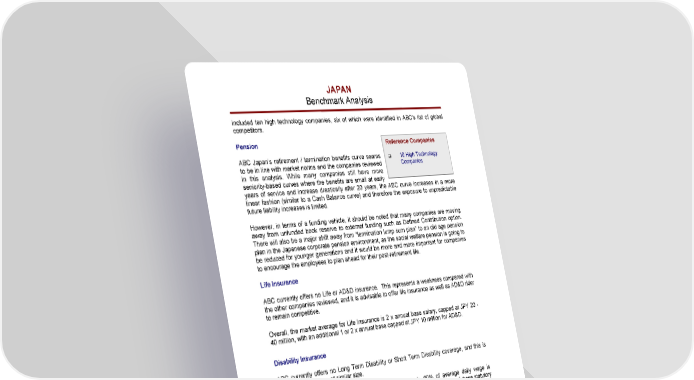 JAPAN Benchmark Analysis included ten high technology companies, six of which were identified in ABC’s list of global competitors. Pension Reference Companies ABC Japan’s retirement / termination benefits curve seems ‰ 10 High Technology to be in line with market norms and the companies reviewed Companies in this analysis. While many companies still have more seniority-based curves where the benefits are small at early years of service and increase drastically after 20 years, the ABC curve increases in a more linear fashion (similar to a Cash Balance curve) and therefore the exposure to unpredictable future liability increases is limited. However, in terms of a funding vehicle, it should be noted that many companies are moving away from unfunded book reserve to external funding such as Defined Contribution option. There will also be a major shift away from “termination lump sum plan” to an old age pension plan in the Japanese corporate pension environment, as the social welfare pension is going to be reduced for younger generations and it would be more and more important for companies to encourage the employees to plan ahead for their post-retirement life. Life Insurance ABC currently offers no Life or AD&D insurance. This represents a weakness compared with the other companies reviewed, and it is advisable to offer life insurance as well as AD&D rider to remain competitive. Overall, the market average for Life Insurance is 2 x annual base salary, capped at JPY 20 - 40 million, with an additional 1 or 2 x annual base capped at JPY 10 million for AD&D. Disability Insurance ABC currently offers no Long Term Disability or Short Term Disability coverage, and this is typical for employers of similar size. When an employee becomes disabled and cannot work, 60% of average daily wage is provided by the government health insurance for up to 18 months. Because of these statutory benefits provided in Japan, most employers in Japan do not provide STD and LTD benefits, with the possible exception of mid-size or large companies that allow employees to choose disability benefits from a list of possible choices in a cafeteria plan. Medical Insurance In Japan, there are many industry-based healthcare plans that are quasi-governmental and contract out of the government medical insurance. Those semi-private plans offer slightly better coverage at smaller premiums to their member companies than the government plan. ABC Japan participates in the healthcare plan of Kanagawa prefecture’s Electric Machinery Association. Overall, the ABC plan is fully consistent with market norms. ABC Japan Co. Ltd. Page B - 10